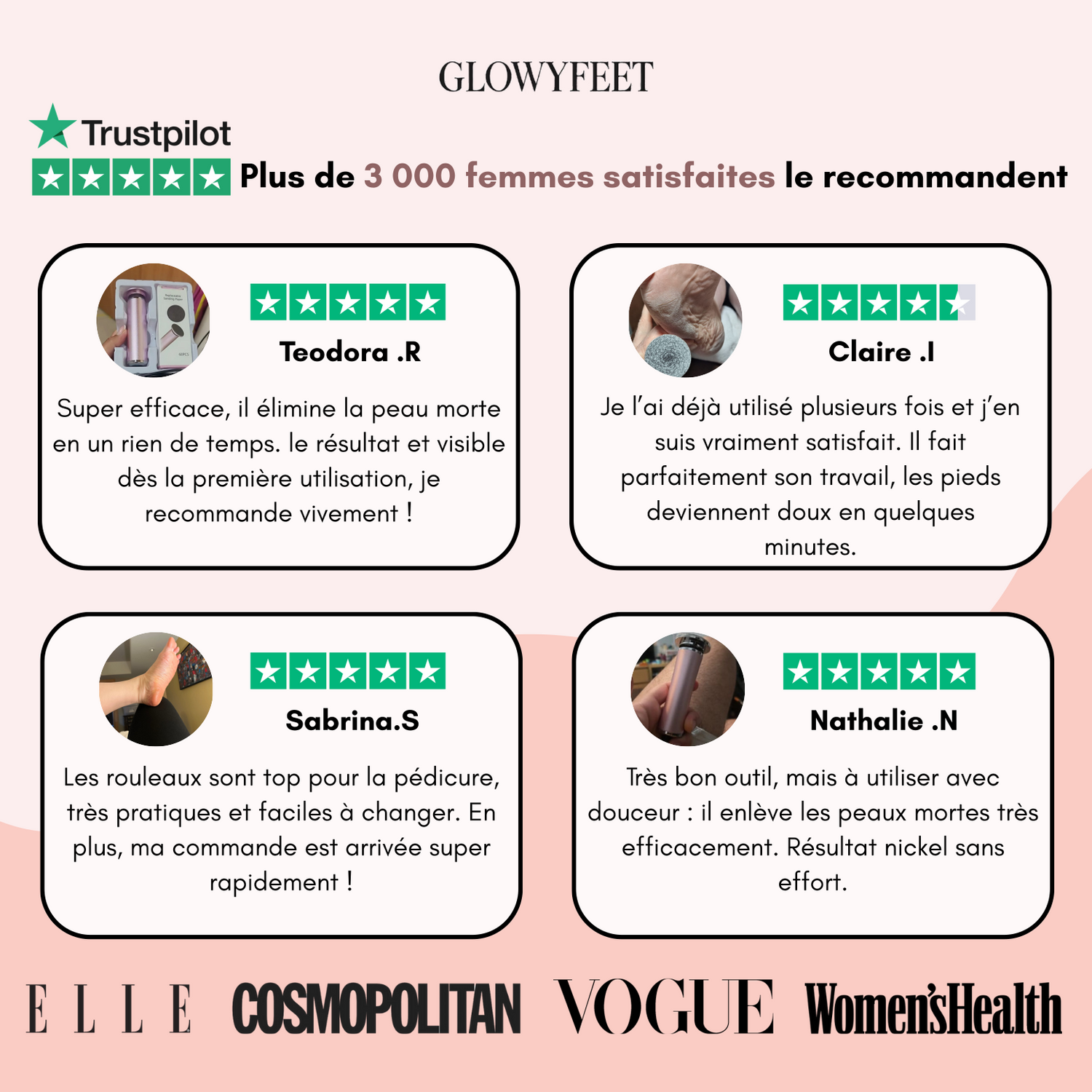 Astuce soin : Après chaque utilisation, appliquez la Crème Collagène GLOWYFEET pour nourrir et prolonger la douceur de vos pieds.
